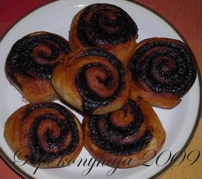 A tészta ugyanaz, a töltelék is. Egészen a sütőbe pakolásig teljesen úgy jártam el, mint a “hagyományos” változatnál. Mindössze annyit változtattam, hogy nem szorosan egymás mellé tettem a csigákat, hanem kicsit távolabb egymástól, és két tepsiben sütöttem. Persze, ha valakinek van tisztességes méretű tepsije, akkor egy is elég. Nekem nincs.