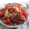 A szójaszeleteket 1-2 órára beáztatom sós, zöldségkeverékes vízbe. Ezután jól kinyomkodom, lisztbe forgatom, és mindkét oldalát kevés olajon kicsit megpirítom. Minden szeletre teszek egy szelet paradicsomot, sózom, borsozom, majd egy-egy szelet sajt megy rá. Az egészet előmelegített sütőbe teszem, és 10-15 percig készre sütöm.