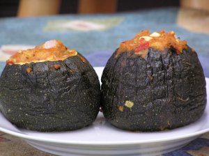 Múlt héten láttam meg a piacon, és azonnal vennem kellett. Azt gondoltam, ez valami új dolog, de aztán utánanéztem a neten, és kiderült, hogy csak nekem új. Akárhogy is, szerintem szuper. Abban biztos voltam, hogy valami töltött cuccot szeretnék belőle készíteni, csak azt nem tudtam, milyet. Aztán kikerült a látóteremből, mert fel kellett tenni a kenyérsütő tetejére, Gergő ugyanis kivette a kamraként üzemelő zöldséges papírzacskóból, és labdaként értelmezte újra, és ennek megfelelően játszott vele. Egy óvatlan pillanatban az egyikbe bele is mélyesztette a fogát. 🙂