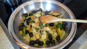 A hagymát hosszában kettévágom, majd további csíkokra. A fokhagymát ferdén felszeletelem. Kevés olajon üvegesre párolom a hagymát, hozzáadom a fokhagymát, majd a vékony darabokra szeletelt cukkínit. Folyamatosan kevegetve sütöm, amíg látszik, hogy már a cukkíni sem nyers. Nem kell neki sok. Ekkor hozzáadom az articsókát és az olajbogyót. Grillzöldséghez való fűszerrel megszórom, alaposan összeforgatom, lefedem és leveszem a tűzről.